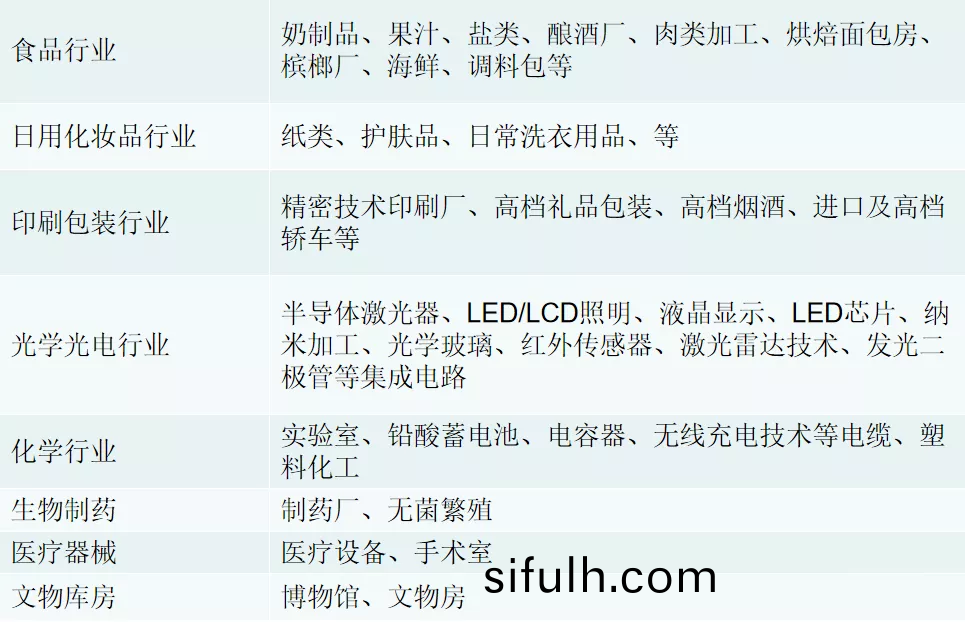 目前,淨(jing)化工程行業(ye)涉(she)及微(wei)電(dian)子、日(ri)常(chang)化粧(zhuang)品(pin)、印(yin)刷(shua)包裝(zhuang)、光(guang)電、化學(xue)、生(sheng)物製藥、醫(yi)療器械(xie)、清潔手術室、航空(kong)航(hang)天(tian)、油(you)漆(qi)、文(wen)物倉(cang)庫(ku)、電子行業(ye)等。